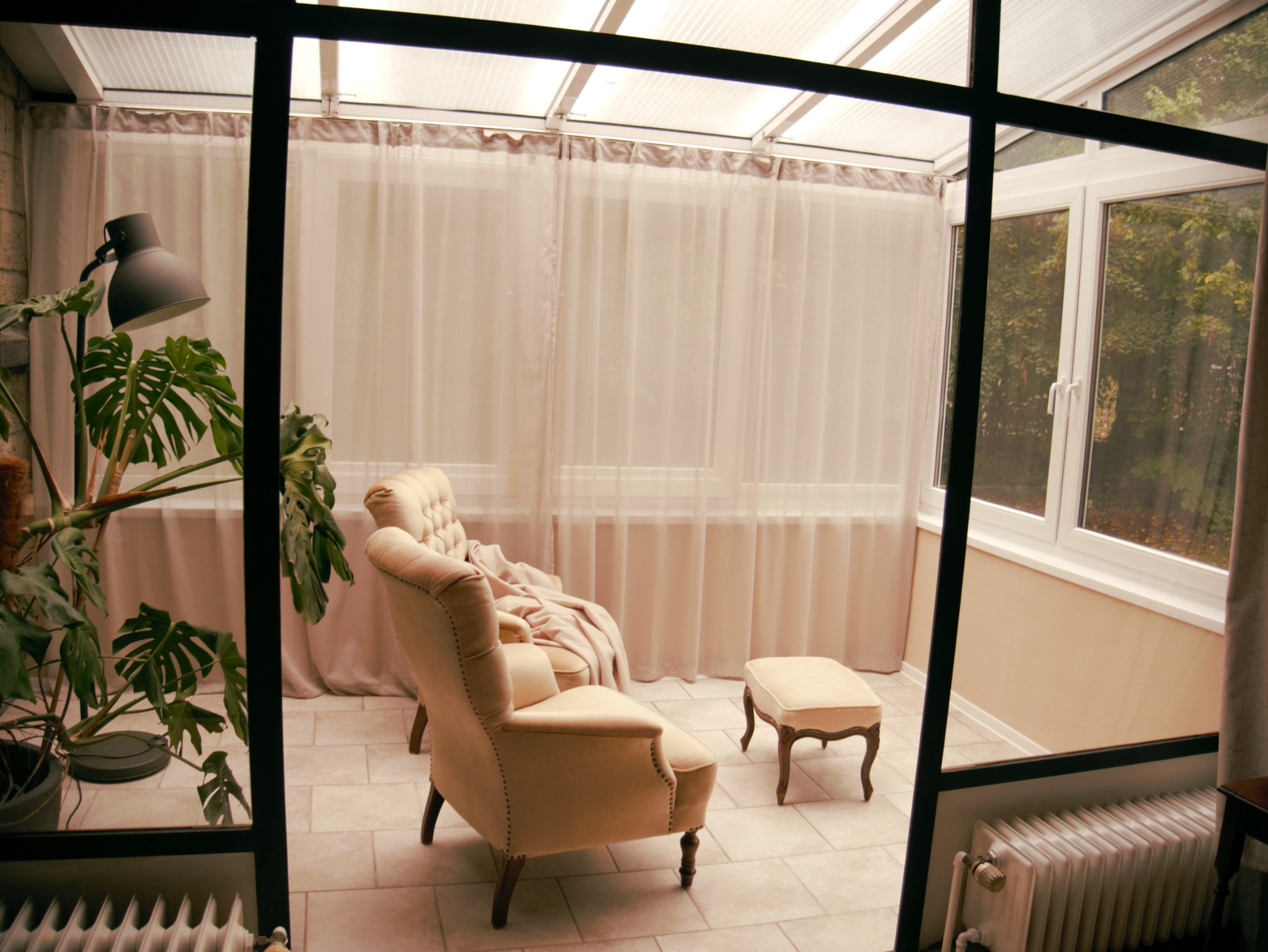 Ein Wintergarten mit Sitzgelegenheit lädt zum Entspannen und Verweilen ein