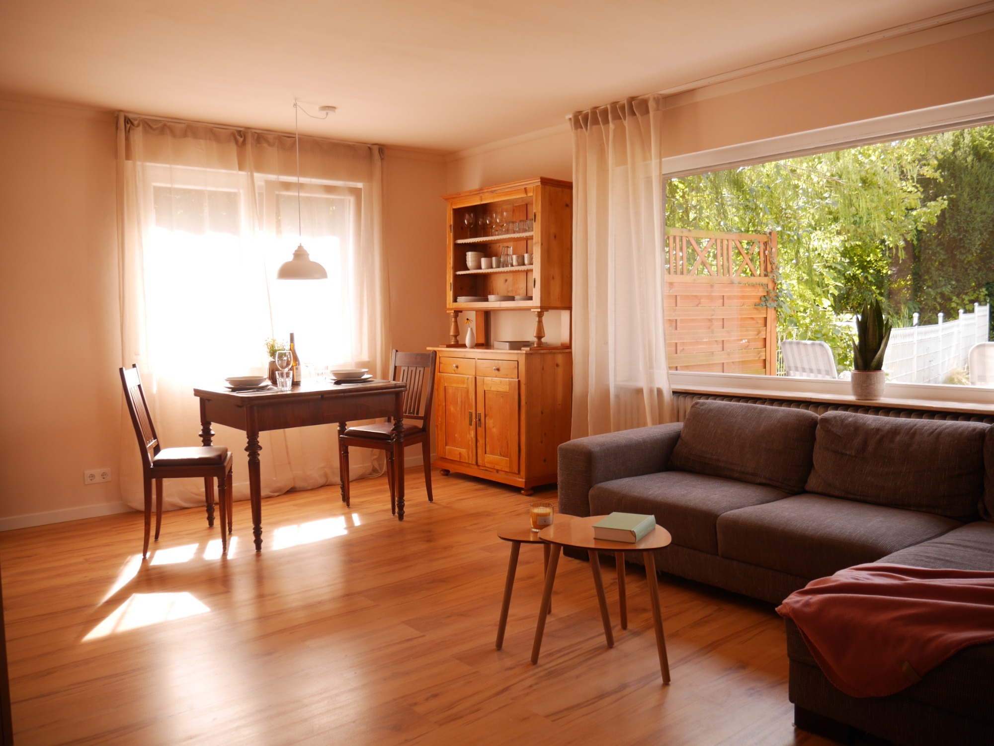 Der Zugang zur Wohnung erfolgt über den eigenen Garten. Die voll ausgestattete Küche öffnet sich zum hellen Wohn- und Essbereich mit gemütlicher Sofaecke und Smart-TV. Vom großzügigen Flur gelangen Sie in die beiden Schlafzimmer, den Wintergarten und die separate Toilette.